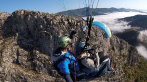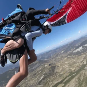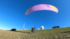 Équipement: nous vous conseillons de prévoir de bonnes chaussures (montantes si possible), un coupe vent et un pantalon. N’hésitez pas à prendre vos lunettes de soleil. Votre moniteur vous équipera d’un casque et d’une sellette de parapente.